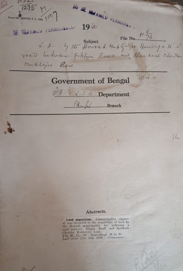 | Rack No. 13, Bundle No. 21 Sl No. 1409 Estimate of Rs. 8347-57 by the Bally Municipality on a/c of Land for widening Modhu Bazar Lane in the villages of Barrackpore. | Rack No. 13, Bundle No. 21 Sl No. 1410 Interpretation of rule 40 of Schedule VI of the B.M. Act, 1932. | Rack No. 13, Bundle No. 21, Sl No. 1411 Revision of electoral roll u/s. 16(2) of the Election Rules framed under B.M. Act, 1932. | Rack No. 13, Bundle No. 21, Sl No. 1412 L.A. by the Howrah Municipality for opening a 16-0" road between Sibpur Road and Aprakash Chandra Mukherjee Lane. | Rack No. 13, Bundle No. 21, Sl No. 1413 LA. by the Rishra-Konnagore Municipality for widening the bad turn in Criper Road in the village of Konnagore. | Rack No. 13, Bundle No. 21, Sl No. 1414 Sanction of the pay of Engineer of the Asansol 1940 Municipality Revision of the Scale of Pay of the Municipal Engineers, Asansol. | Rack No. 13, Bundle No. 21, Sl No. 1415 Assessment of the E.I. and B.N. Railway Properties in the Municipal area of Howrah. |