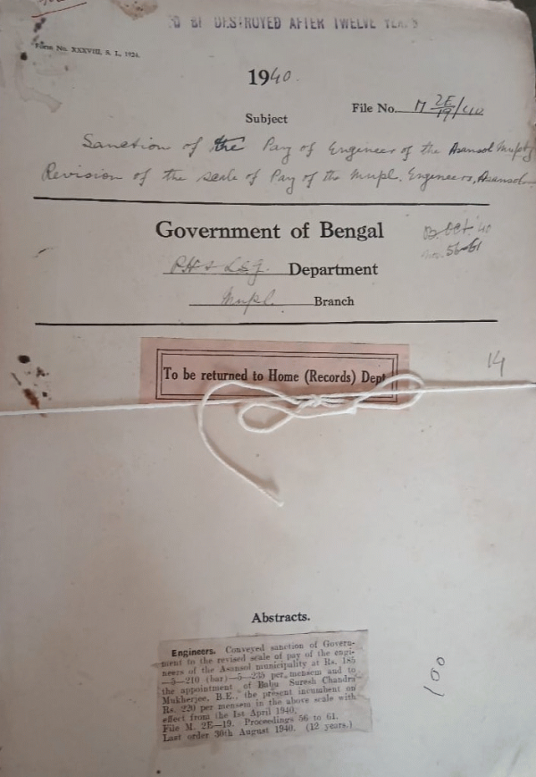 | Rack No. 13, Bundle No. 21, Sl No. 1411 Revision of electoral roll u/s. 16(2) of the Election Rules framed under B.M. Act, 1932. | Rack No. 13, Bundle No. 21, Sl No. 1412 L.A. by the Howrah Municipality for opening a 16-0" road between Sibpur Road and Aprakash Chandra Mukherjee Lane. | Rack No. 13, Bundle No. 21, Sl No. 1413 LA. by the Rishra-Konnagore Municipality for widening the bad turn in Criper Road in the village of Konnagore. | Rack No. 13, Bundle No. 21, Sl No. 1414 Sanction of the pay of Engineer of the Asansol 1940 Municipality Revision of the Scale of Pay of the Municipal Engineers, Asansol. | Rack No. 13, Bundle No. 21, Sl No. 1415 Assessment of the E.I. and B.N. Railway Properties in the Municipal area of Howrah. | Rack No. 13, Bundle No. 21, Sl No. 1416 Definition of a unit of building for the purpose of imposing Municipal taxes. | Rack No. 13, Bundle No. 21, Sl No. 1417 Adoption of model bye-laws regarding standerdization of weights and measures. |