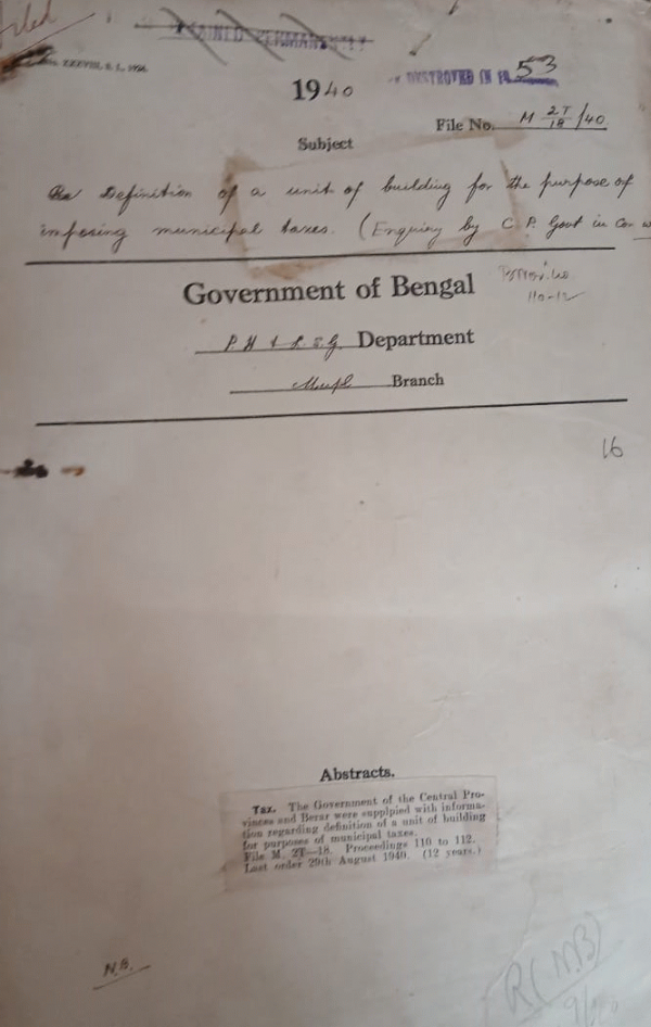| Rack No. 13, Bundle No. 21, Sl No. 1413 LA. by the Rishra-Konnagore Municipality for widening the bad turn in Criper Road in the village of Konnagore. | Rack No. 13, Bundle No. 21, Sl No. 1414 Sanction of the pay of Engineer of the Asansol 1940 Municipality Revision of the Scale of Pay of the Municipal Engineers, Asansol. | Rack No. 13, Bundle No. 21, Sl No. 1415 Assessment of the E.I. and B.N. Railway Properties in the Municipal area of Howrah. | Rack No. 13, Bundle No. 21, Sl No. 1416 Definition of a unit of building for the purpose of imposing Municipal taxes. | Rack No. 13, Bundle No. 21, Sl No. 1417 Adoption of model bye-laws regarding standerdization of weights and measures. | Rack No. 13, Bundle No. 21, Sl No. 1418 Petition from Dr. Harendra Nath Das regarding the return of his Election Expenses to the Corporation. | Rack No. 13, Bundle No. 21, Sl No. 1419 Audit objection to the Payment of Railway fare from Bombay to Calcutta to Mr. J.A. Parks, Dy, Valuer, C.LT. |