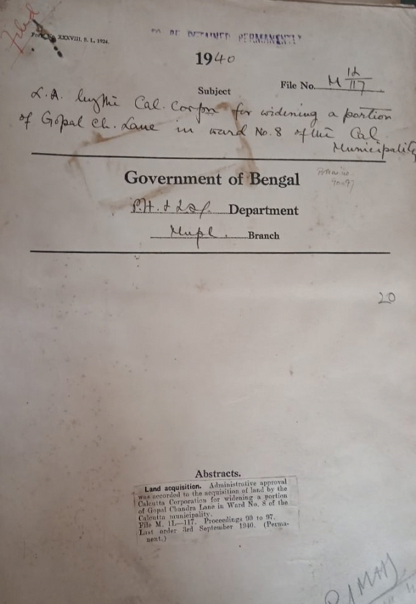 L.A. by the Cal. Corporation for widening a portion of Gopal Chandra lane in word 8 of the Calcutta Municipality.