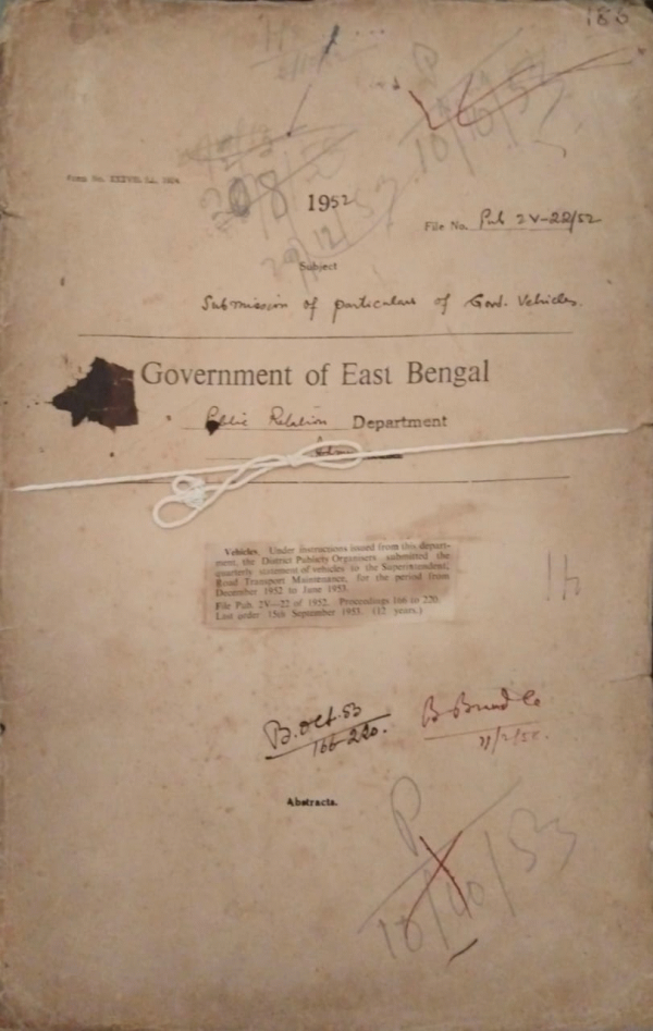 | Rack No. 18, Bundle No. 08, SI No. 546 Fixation of the annual allotment for stationery of the year 1951-54. | Rack No. 18, Bundle No. 08, SI No. 547 Posting of Supervisor Cum Mechanics. | Rack No. 18, Bundle No. 08, SI No. 548 Purchase of cloud speaker for the use of the D.M. Unit, Chittagong. | Rack No. 18, Bundle No. 08, SI No. 549 Submission of particulars of govt. Vehicles. | Rack No. 18, Bundle No. 08, SI No. 550 Disciplinary action taken against the trainees of this department. | Rack No. 18, Bundle No. 08, SI No. 551 L.R. opinion on certificate as to the validity of the like of the land relating to H.B. advance. | Rack No. 18, Bundle No. 08, SI No. 552 Deputation of Mr. Anwar Hussain Dy. Director of publicity to Karachi to study the technique of publicity. |