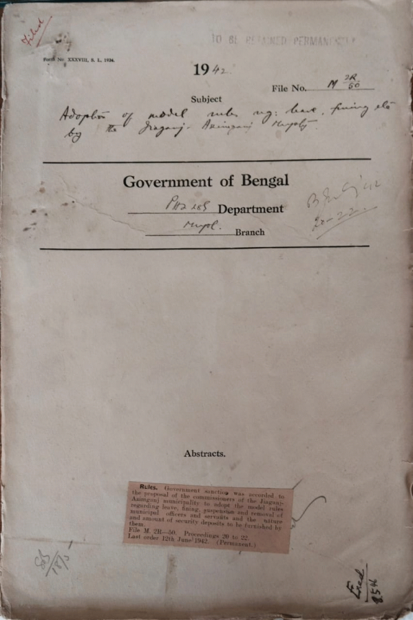 | Rack No. 13, Bundle No. 26, Sl No. 1792 Revision of boundary, Patuakhali Municipality. | Rack No. 13, Bundle No. 26, Sl No. 1793 Council Question by Khan Bahadur Salyed Muzzamuddin Hossain regarding Burial Ground Boards. | Rack No. 13, Bundle No. 26, Sl No. 1794 Regarding of the pay of Babu Hari Bilas Bahaduri the building Inspector of the Howrah Municipality. | Rack No. 13, Bundle No. 26, Sl No. 1795 Adoption of model rules regarding leave, fining suspension etc by the Jiaganj Azimganj Municipality. | Rack No. 13, Bundle No. 26, Sl No. 1796 A.Q. by Khan Bahadur Mohammad Ali regarding Supersession of the Chittagong Municipality. | Rack No. 13, Bundle No. 26, Sl No. 1797 Budget estimates of the Muhammadan Burial Board for the year 1942-43. | Rack No. 13, Bundle No. 26, Sl No. 1798 Reconstitution of the Bajitpur Municipality. |