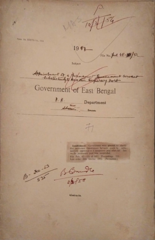 | Rack No. 18, Bundle No. 08, SI No. 556 Surety of Mr. S Monwar Hussain U.D.A. of this department for loan of Rs 2000/- from R.R.F. | Rack No. 18, Bundle No. 08, SI No. 557 Proposed for payment of office rent for the office of the S.D.P.O. Khulna (Sadar). | Rack No. 18, Bundle No. 08, SI No. 558 Change of designation of Serajul Huque Choudhury of R.P.S. office. | Rack No. 18, Bundle No. 08, SI No. 559 Appointment of permanent govt. servant substantively to another temporary post. | Rack No. 18, Bundle No. 08, SI No. 560 Retention of the temporary post of P.A.E. operator and peons of P.R. department. | Rack No. 18, Bundle No. 08, SI No. 561 Prayer from Mvi Mahbub Hossain, operator D.M. Unit Chittagong. | Rack No. 18, Bundle No. 08, SI No. 562 Prayer from Mvi. Telwat Hossain operator of the D.M. Unit Noakhali. |
