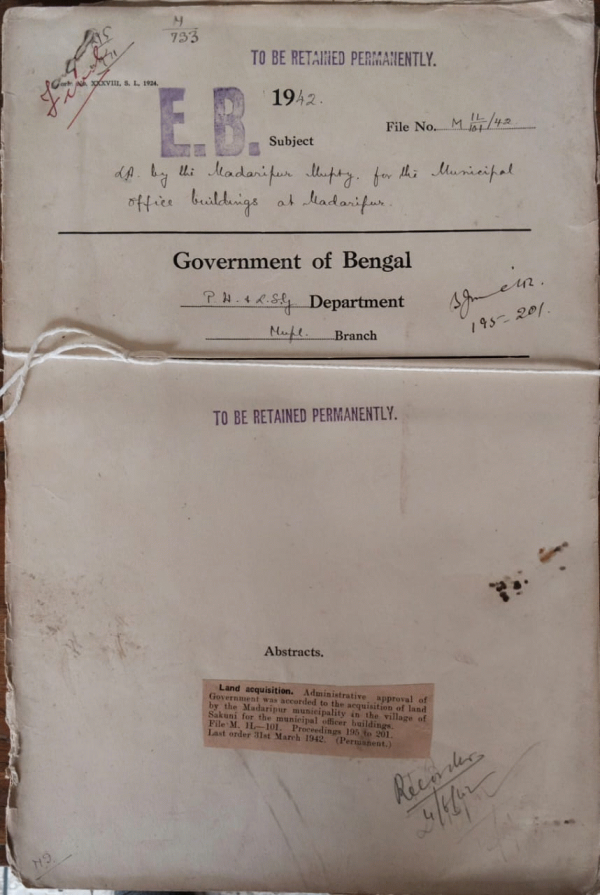 | Rack No. 13, Bundle No. 26, Sl No. 1796 A.Q. by Khan Bahadur Mohammad Ali regarding Supersession of the Chittagong Municipality. | Rack No. 13, Bundle No. 26, Sl No. 1797 Budget estimates of the Muhammadan Burial Board for the year 1942-43. | Rack No. 13, Bundle No. 26, Sl No. 1798 Reconstitution of the Bajitpur Municipality. | Rack No. 13, Bundle No. 26, Sl No. 1799 L.A. by the Madaripur office buildings at Madaripur. | Rack No. 13, Bundle No. 26, Sl No. 1800 L.A. by the Madaripur Municipality for the Municipal office building at Madaripur. | Rack No. 13, Bundle No. 27, Sl No. 1801 Proposal for the grant of Rs. 100/- to the imambara Hospital at Chinsurah by the Bansbaria Municipality for the Year 1941-42. | Rack No. 13, Bundle No. 27, Sl No. 1802 Increase in the number of Commissioner Narayanganj Municipality. |