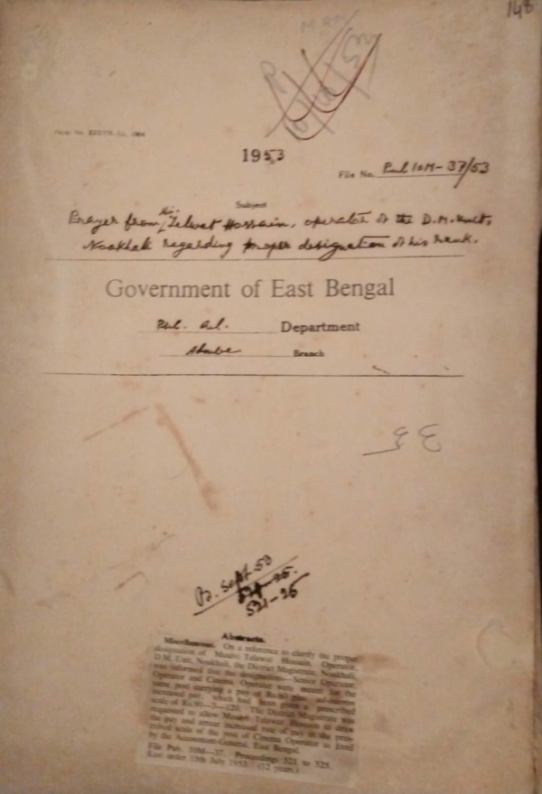 | Rack No. 18, Bundle No. 08, SI No. 559 Appointment of permanent govt. servant substantively to another temporary post. | Rack No. 18, Bundle No. 08, SI No. 560 Retention of the temporary post of P.A.E. operator and peons of P.R. department. | Rack No. 18, Bundle No. 08, SI No. 561 Prayer from Mvi Mahbub Hossain, operator D.M. Unit Chittagong. | Rack No. 18, Bundle No. 08, SI No. 562 Prayer from Mvi. Telwat Hossain operator of the D.M. Unit Noakhali. | Rack No. 18, Bundle No. 08, SI No. 563 Pray for the grant of an additional allowance to Mir Ashraf Uddin Ahmed, S.D.P. West circle Munshiganj , Dacca. | Rack No. 18, Bundle No. 08, SI No. 564 Change in the nature the course selected from trainees under the technical assistance programme. | Rack No. 18, Bundle No. 08, SI No. 565 Grant and acceptance of Pakistan and foreign awards. |