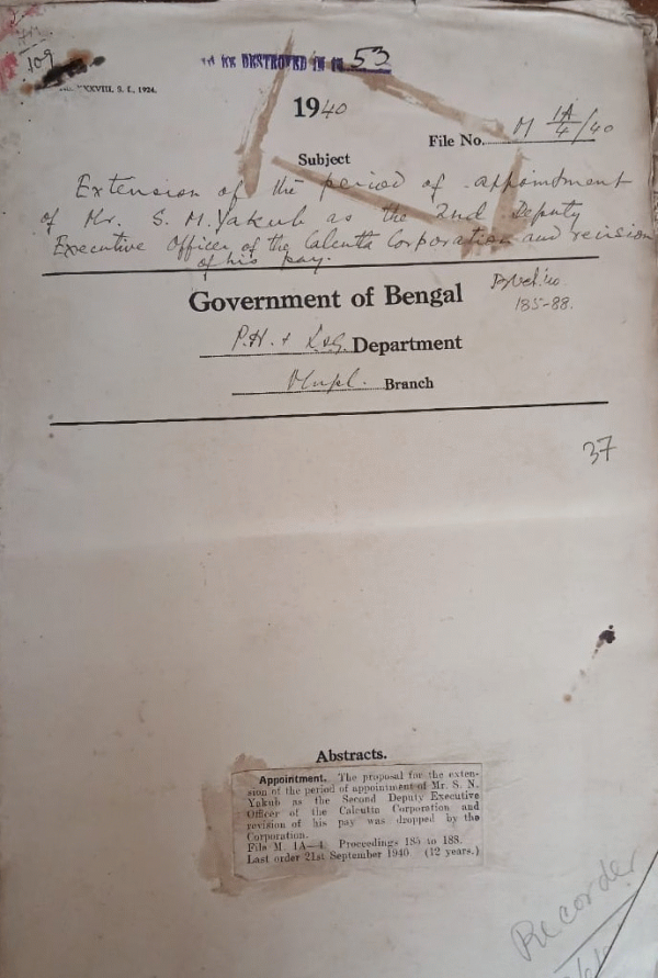 | Rack No. 13, Bundle No. 21, Sl No. 1434 Increment of pay of the Executive officer Titagarh Municipality. | Rack No. 13, Bundle No. 21, Sl No. 1435 C.Q. by Mr. K.C. Roy Chowdhury regarding Calcutta Improvement Scheme. | Rack No. 13, Bundle No. 21, Sl No. 1436 Re-appointment of MR. J.C. Mukherjee as the Chief executive officer of the Calcutta Corporation. | Rack No. 13, Bundle No. 21, Sl No. 1437 Extension of the period of appointment of Mr. S.M. Yakub as the 2nd Executive officer of the Calcutta Corporation. | Rack No. 13, Bundle No. 21, Sl No. 1438 Suspension of the executive of the resolution passed by the Jangipur Municipality granting remission of the rent of the Jangirpur Ferry. | Rack No. 13, Bundle No. 21, Sl No. 1439 Adoption of model rules of business by the Commissioner of the Birnagar Municipality. | Rack No. 13, Bundle No. 21, Sl No. 1440 Permission to the District Magistrate Howrah to the associated with the Board U/S. 19(1) of the Calcutta Improvement Act, 1911. |