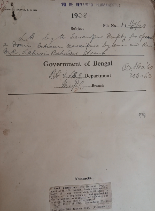 L.A. by the Serampore Municipality for opening a drain between Baruipora by lane and Rai. M.C. Lahiri Bahadur Street.