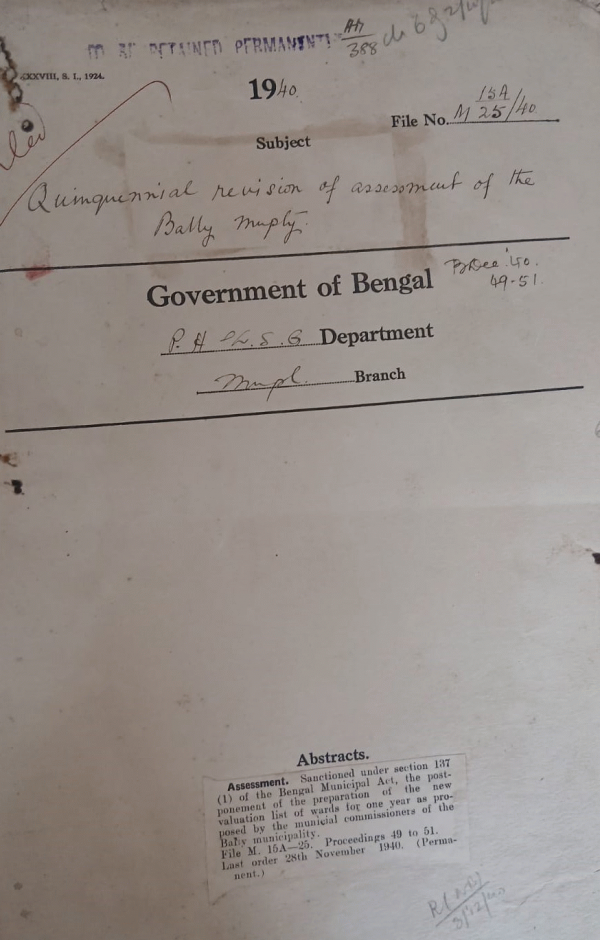 | Rack No. 13, Bundle No. 22, Sl No. 1461 Appointment of Mr. G.N. Mukherjee, as an assessor Municipality on contract basis. | Rack No. 13, Bundle No. 22, Sl No. 1462 Cal. Corporation loans Rates of growth of sinking Funds for 1941-42. | Rack No. 13, Bundle No. 22, Sl No. 1463 Leave of the Chief executive officer, Cal. corporation and acting arrangements in his Place. | Rack No. 13, Bundle No. 22, Sl No. 1464 Quin quennial revision of assessment of the Bully Municipality. | Rack No. 13, Bundle No. 22, Sl No. 1465 Grant of Priority certificate to Messrs. Robert Me-lean and Co. ltd. for the important of 4500ft of Acme Fire Hose from England. | Rack No. 13, Bundle No. 22, Sl No. 1466 A.Q. by Mr. Abdur Raschid Mahmood, M.L.A. . regarding the number of Muslim Population of the Pabna and Serajganj Municipality. | Rack No. 13, Bundle No. 22, Sl No. 1467 Leave of Chirma, Bhatpara Municipality, and arrangement in his place. |