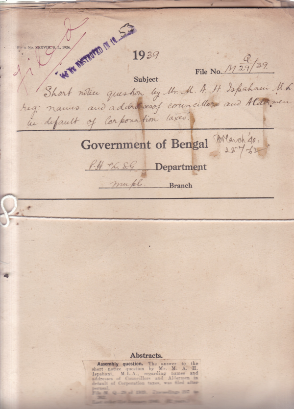 Short Notice Question by Mr. M.A.H. Ispahani, M.L.A. regarding names and address of Councilors and Aldermen in default of Corporation taxes.