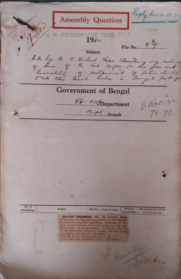 A.Q. by Mr. M. Farhad Reza Chowdhury regarding extension of the term of the Calcutta Corporation for one year and desirability of Postponement of future election to all other local bodies in Bengal for one year.