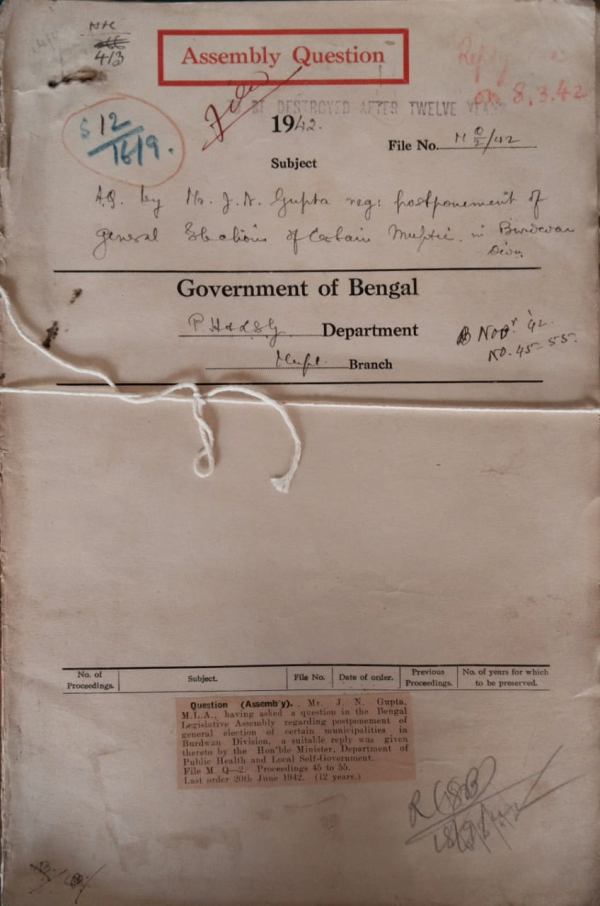 | Rack No. 13, Bundle No. 27, Sl No. 1817 Govt. Advocates for L.A. Cases of the Calcutta Improvement Trust. | Rack No. 13, Bundle No. 27, Sl No. 1818 Expenditure of Rs. 1/15/ incurred by the Jamalpur Municipality for Sending a telegram to Honorable Minister in Charge Praying for reconsideration of the order of transfer of the local Assistant Surgeon. | Rack No. 13, Bundle No. 27, Sl No. 1819 Expenditure of Rs. 40/8/ incurred by the Asansol Municipality in presenting addresses to P.H. & L.S.G. Department. | Rack No. 13, Bundle No. 27, Sl No. 1820 A.Q. by Mr. I.N. Gupta regarding postponement of general Election of Certain Municipalities in Burdwan | Rack No. 13, Bundle No. 27, Sl No. 1821 Levy of taxes on Cycles and dogs outside Calcutta and Howrah. | Rack No. 13, Bundle No. 27, Sl No. 1822 Appointment of Babu Santi Saram Banerje as Engineer of the Chittagong Municipality. | Rack No. 13, Bundle No. 27, Sl No. 1823 Sanction to the payment of Rs. 200/- by the |