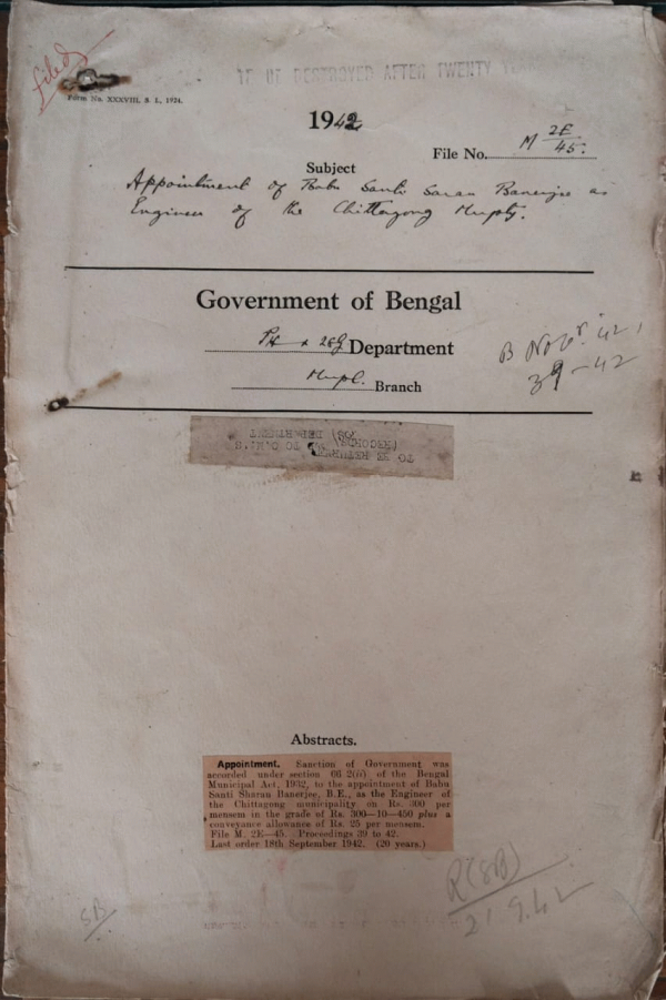 Appointment of Babu Santi Saram Banerje as Engineer of the Chittagong Municipality.