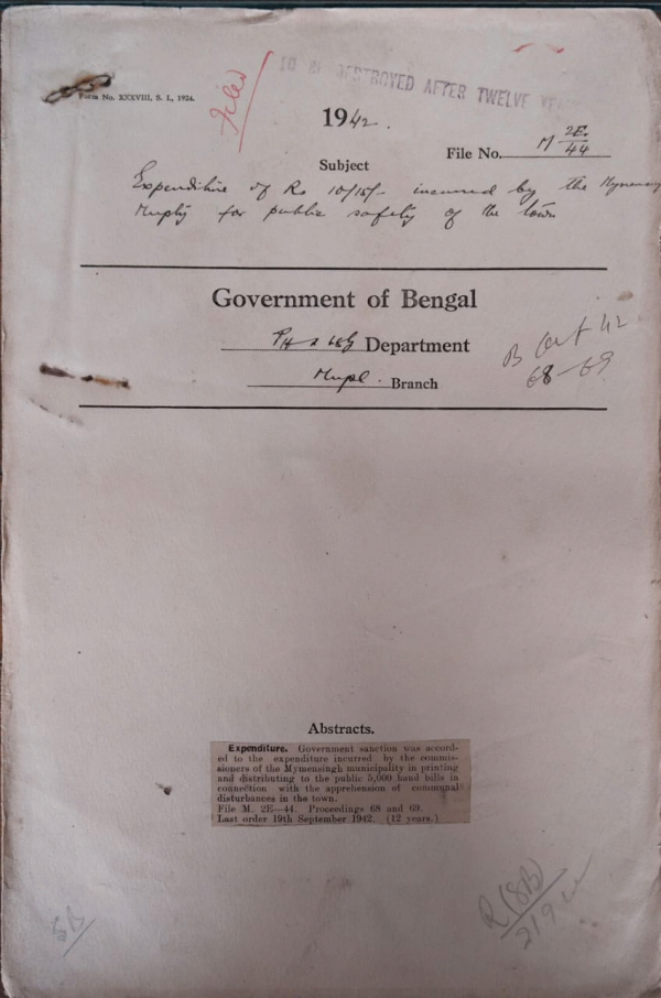 Expenditure of Rs. 10/15/- incurred by the Mymensingh Municipality for public safety of the town.
