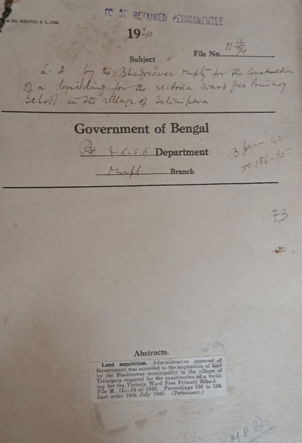 L.A. by the Bhadreswar Municipality for the construction of a building for the Victoria ward free Primary School in village of Telinipara.