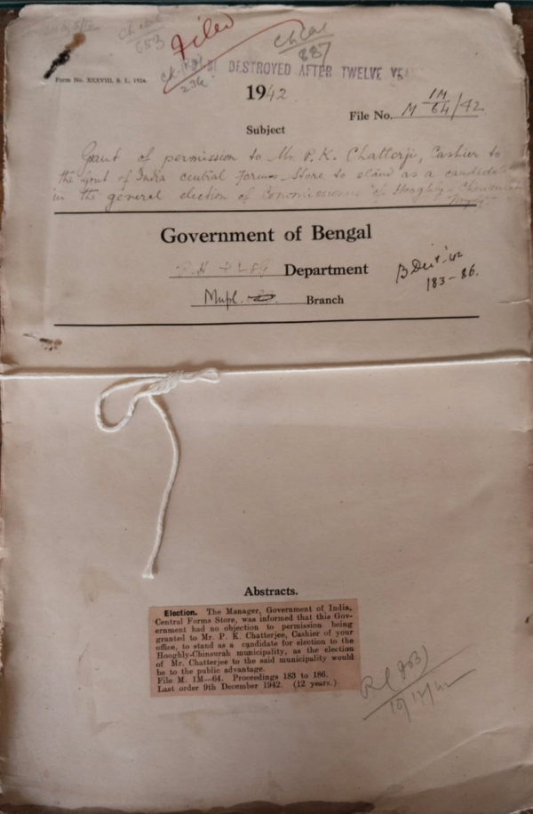 Grant of Permission to Mr. P.K. Chattarjee, Cashier to the govt. of India Central forms store to stand as a candidate in the general election of Commissioners of Hooghly Chinsurah Municipality.