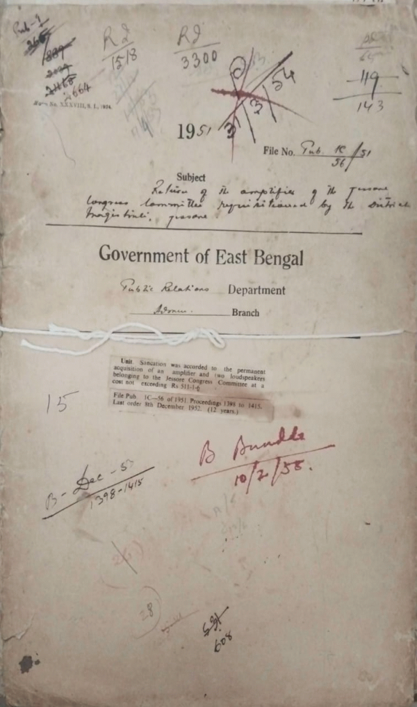 | Rack No. 18, Bundle No. 09, SI No. 592 Return of second hand parts of govt. vehicles t the central workshp, Tejgoan. | Rack No. 18, Bundle No. 09, SI No. 593 Purchase of tarpaulins for supply to the D.M. Units. | Rack No. 18, Bundle No. 09, SI No. 594 Reversion of Mvi. A. Samad Khan to his deputation to the ministry of foreign affairs and C.R. Govt. of Pakistan. | Rack No. 18, Bundle No. 09, SI No. 595 Cost of acquisition of the amplifier set requisitioned by the D.M. Jessore from congress committee. | Rack No. 18, Bundle No. 09, SI No. 596 Renewal of Radio Licenses. | Rack No. 18, Bundle No. 09, SI No. 597 Quotation of portable Cinema Equipments. | Rack No. 18, Bundle No. 09, SI No. 598 Transfer of district and sub-divisional publicity organizers. |