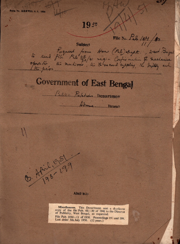 | Rack No. 18, Bundle No. 02, SI No. 128 Detention of Mail Steamer playing in East Bengal on account of late embarkation of Senior Civil of Military officers. | Rack No. 18, Bundle No. 02, SI No. 129 Sanction was accorded to the expenditure of Rs. 24000 only incurred in connection with the purchase of two amplifiers for projectors. | Rack No. 18, Bundle No. 02, SI No. 130 Cinematograph Act & Rules Receivable of operators license free of Cost. | Rack No. 18, Bundle No. 02, SI No. 131 This Department sent a duplicate copy of the file Pub-30 of 1941 to the Director of Publicity West Bengal as requested. | Rack No. 18, Bundle No. 02, SI No. 132 Verification of age of Mvi. Md. Ismail Hossain D.P,O,Kustia. | Rack No. 18, Bundle No. 02, SI No. 133 Sending of Service book of B/U Profulla Kumar Misra, Ex- clerk of D.P,O. Khulna. | Rack No. 18, Bundle No. 02, SI No. 134 Advantages of the insuring with the post office insurance fund were Circulated to this Department. |