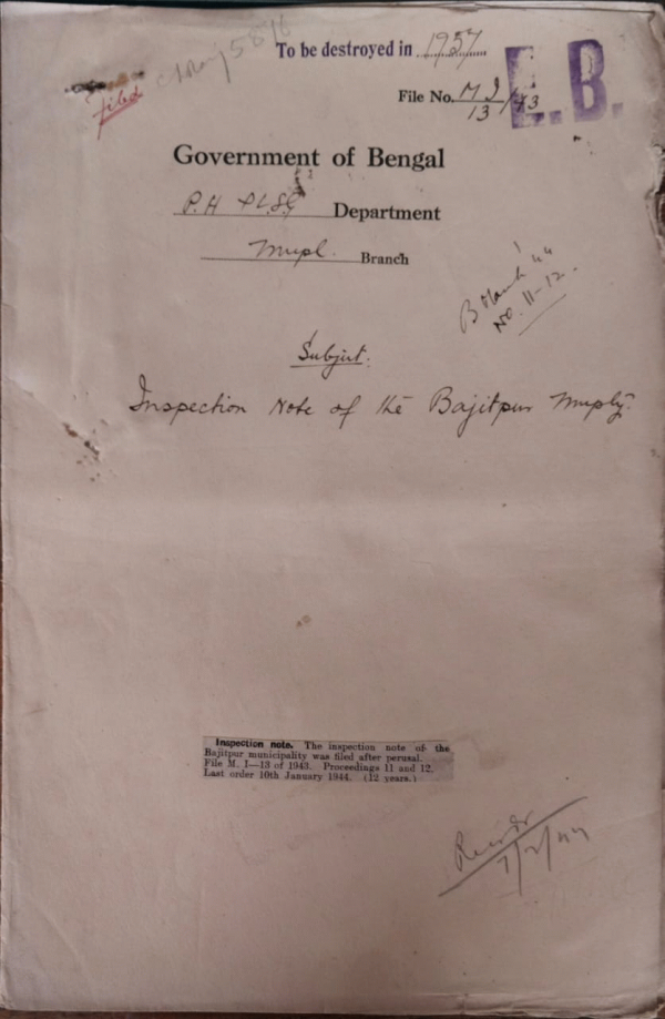 | Rack No. 13, Bundle No. 27, Sl No. 1842 Resolution by the Commissioners of the Dacca Municipality to adjourned their meeting as a mark of protest against the action of govt. in arresting Mahatmaji Gandhi and other leaders. | Rack No. 13, Bundle No. 27, Sl No. 1843 Proposed exemption of the Momen girls M.Ε. School at Jessore from payment of rate to the Jessore Municipality. | Rack No. 13, Bundle No. 27, Sl No. 1844 Payment of Contributions of Rs. 30/- and Rs. 30/- respectively, to the Ramkrishna Seva Samity and the Radharaman Sevasram, Nabadwip, for the year 1943-44. | Rack No. 13, Bundle No. 27, Sl No. 1845 Inspection Note of the Bajitpur Municipality. | Rack No. 13, Bundle No. 27, Sl No. 1846 Reconstitution of the Serajganj Municipality. | Rack No. 13, Bundle No. 27, Sl No. 1848 Affairs of the Nator Municipality. | Rack No. 13, Bundle No. 27, Sl No. 1849 Proposed postponement of the recovery of advances made from the P.F. Accounts to the employees of the Faridpur Municipality. |