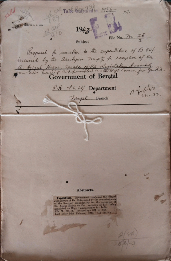 Proposal for Sanction to the expenditure of Rs. 50/- incurred by the Santipur Municipality for the reception of Sir M. Azizul Haque, Speaker of the Legislative Assembly.