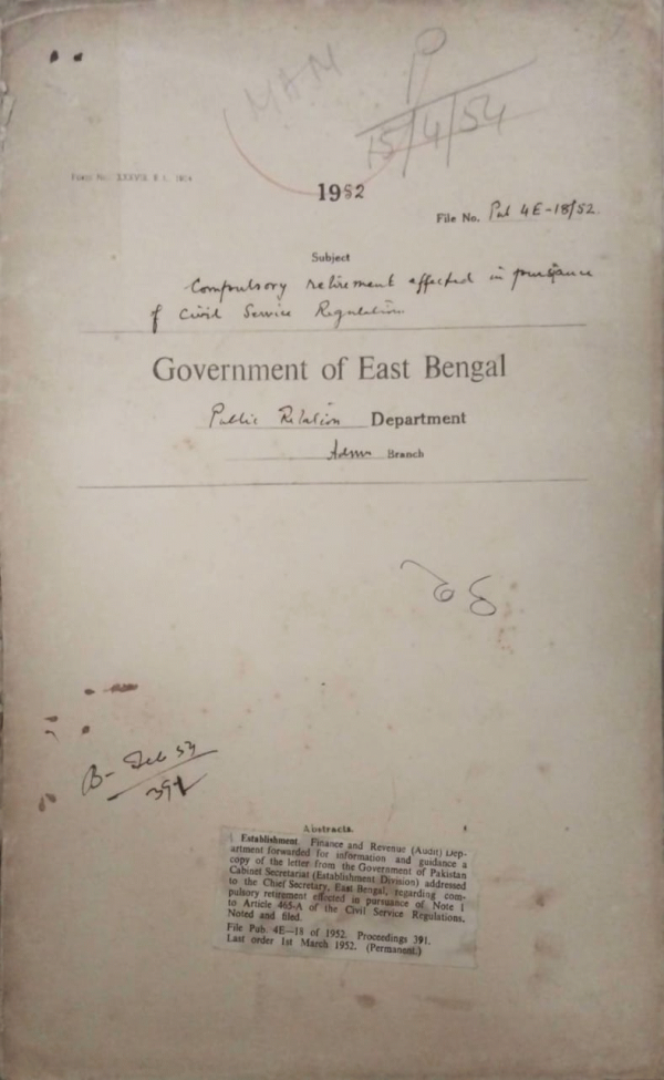 | Rack No. 18, Bundle No. 09, SI No. 603 Submission of application for leave preparatory to retirement. | Rack No. 18, Bundle No. 09, SI No. 604 Recruitment to central services made on a local basis as an all Pakistan basis. | Rack No. 18, Bundle No. 09, SI No. 605 Instruction for submission receipt and transmission of petitions to the governor general. | Rack No. 18, Bundle No. 09, SI No. 606 Compulsory retirement effected in pursuance of civil service regulation. | Rack No. 18, Bundle No. 09, SI No. 607 Pay of temporary or probationary L.D.A. on probation to U.D.A. | Rack No. 18, Bundle No. 09, SI No. 608 Rules for drawing special pay or recurring honorarium. | Rack No. 18, Bundle No. 09, SI No. 609 Grant of rent for hire of a house for the battery charging centre, Manikganj. |