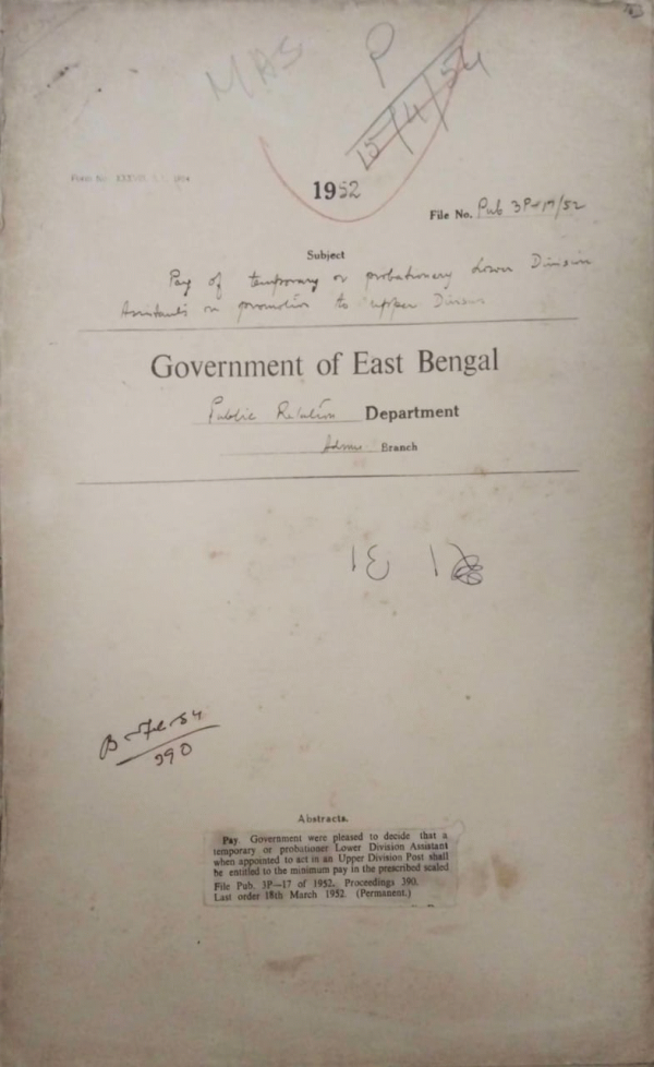 | Rack No. 18, Bundle No. 09, SI No. 604 Recruitment to central services made on a local basis as an all Pakistan basis. | Rack No. 18, Bundle No. 09, SI No. 605 Instruction for submission receipt and transmission of petitions to the governor general. | Rack No. 18, Bundle No. 09, SI No. 606 Compulsory retirement effected in pursuance of civil service regulation. | Rack No. 18, Bundle No. 09, SI No. 607 Pay of temporary or probationary L.D.A. on probation to U.D.A. | Rack No. 18, Bundle No. 09, SI No. 608 Rules for drawing special pay or recurring honorarium. | Rack No. 18, Bundle No. 09, SI No. 609 Grant of rent for hire of a house for the battery charging centre, Manikganj. | Rack No. 18, Bundle No. 09, SI No. 610 Retention of the staff of the Editorial section of the P.R. Department. |
