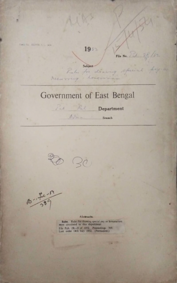 | Rack No. 18, Bundle No. 09, SI No. 605 Instruction for submission receipt and transmission of petitions to the governor general. | Rack No. 18, Bundle No. 09, SI No. 606 Compulsory retirement effected in pursuance of civil service regulation. | Rack No. 18, Bundle No. 09, SI No. 607 Pay of temporary or probationary L.D.A. on probation to U.D.A. | Rack No. 18, Bundle No. 09, SI No. 608 Rules for drawing special pay or recurring honorarium. | Rack No. 18, Bundle No. 09, SI No. 609 Grant of rent for hire of a house for the battery charging centre, Manikganj. | Rack No. 18, Bundle No. 09, SI No. 610 Retention of the staff of the Editorial section of the P.R. Department. | Rack No. 18, Bundle No. 09, SI No. 611 Verification of services of Babu Suddhangshu Sekhar Sanyat formerly compounder of D.M. Unit Pabna. |