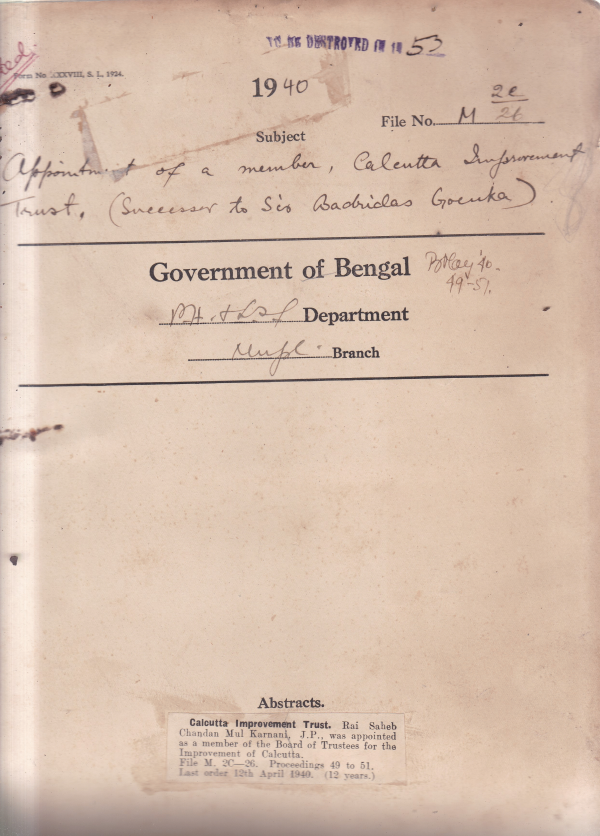 | Rack No. 13, Bundle No. 18, Sl No. 1202 L.A. by the Cal. Corporation for improving the corner of the premises no. 14 A, Rogue Nath Cheterjee lane. | Rack No. 13, Bundle No. 18, Sl No. 1203 A.C. for the Municipal Burning Ghat at Madaripur. | Rack No. 13, Bundle No. 18, Sl No. 1204 L.A. by the Garden Reach Municipality for the widening the Junction of Akra Road and Panchpara road in the village Dum Dum Kismat. | Rack No. 13, Bundle No. 18, Sl No. 1205 Appointment of a member Cal. 9. Trust. | Rack No. 13, Bundle No. 18, Sl No. 1206 Representation of Marwari Association on the Cal. Improvement Trust. | Rack No. 13, Bundle No. 18, Sl No. 1207 L.A. by the Jalpaiguri Municipality for Construction of a beet stall in ward no. III of the said Municipality. | Rack No. 13, Bundle No. 18, Sl No. 1208 Resolution Passed by the Muhammadan Burial Board for the substitution of the word "muslim" in place of the word Muhammadan. |