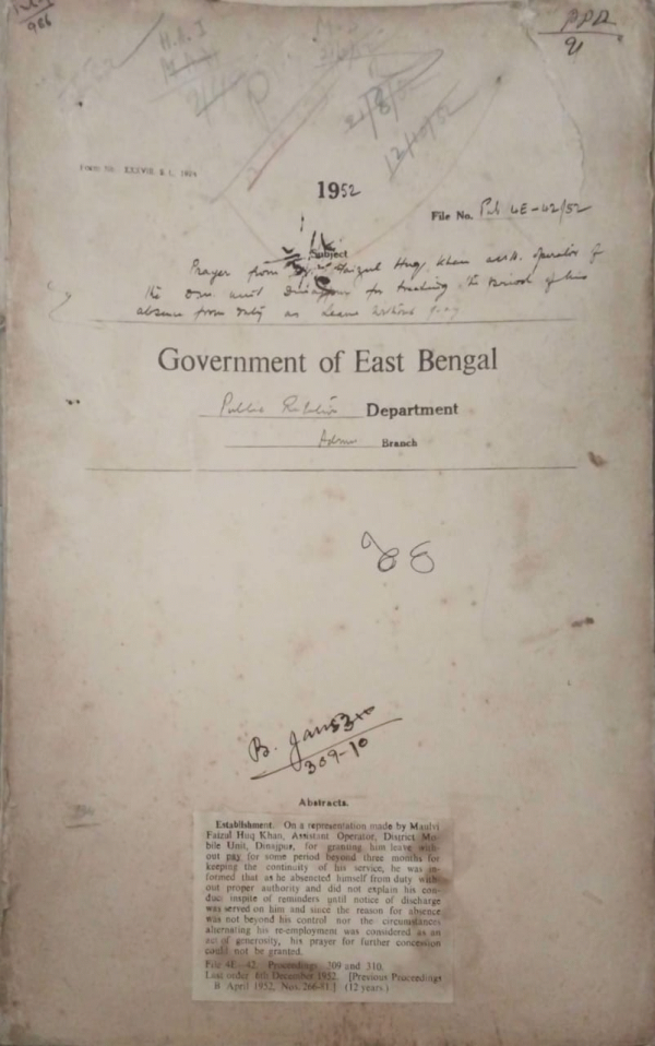 | Rack No. 18, Bundle No. 09, SI No. 611 Verification of services of Babu Suddhangshu Sekhar Sanyat formerly compounder of D.M. Unit Pabna. | Rack No. 18, Bundle No. 09, SI No. 612 Arrangement for hire of green boats for the D.M. Units, during the year 1953-54. | Rack No. 18, Bundle No. 09, SI No. 613 Inspection of govt. vans by the Inspector appointed by the Home Department. | Rack No. 18, Bundle No. 09, SI No. 614 Prayer from Mr. Fayzul Huq Khan assistant operator of the D.M. Unit, Dinajpur. | Rack No. 18, Bundle No. 09, SI No. 615 Amendment treasury rules. | Rack No. 18, Bundle No. 09, SI No. 616 Supply of information regarding acquisition of immovable property by govt. | Rack No. 18, Bundle No. 09, SI No. 617 Amendment of public service commission regulations 1937. |