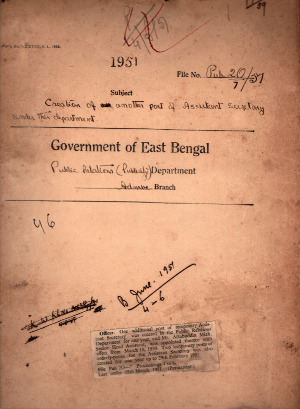 | Rack No. 18, Bundle No. 02, SI No. 148 Sanction was accorded to the total expenditure of Rs, 731-6 incurred in connection with the purchase of 6 Volts batteries and distilled water. | Rack No. 18, Bundle No. 02, SI No. 149 Sanction of Government was accorded to the Sanction of advance of Rs. 336 from the amount at credit in the General Provident Fund of Moulvi. Md. Abdus Samad | Rack No. 18, Bundle No. 02, SI No. 150 Proposed Purchase of Pakistan National Flag Trailers. | Rack No. 18, Bundle No. 02, SI No. 151 Creation of another post of Assistant Secretary under the department. | Rack No. 18, Bundle No. 02, SI No. 152 Government were pleased to allow Mr. S,M. Masood actual 1st callas fare the journeys made by item to Chittagong and Pubail. | Rack No. 18, Bundle No. 02, SI No. 153 Taking over Charge of Assistant Secretary under the Public Relation Department. | Rack No. 18, Bundle No. 02, SI No. 154 Subscription for Islamic Review for the use of H.P.H. East Bengal. |