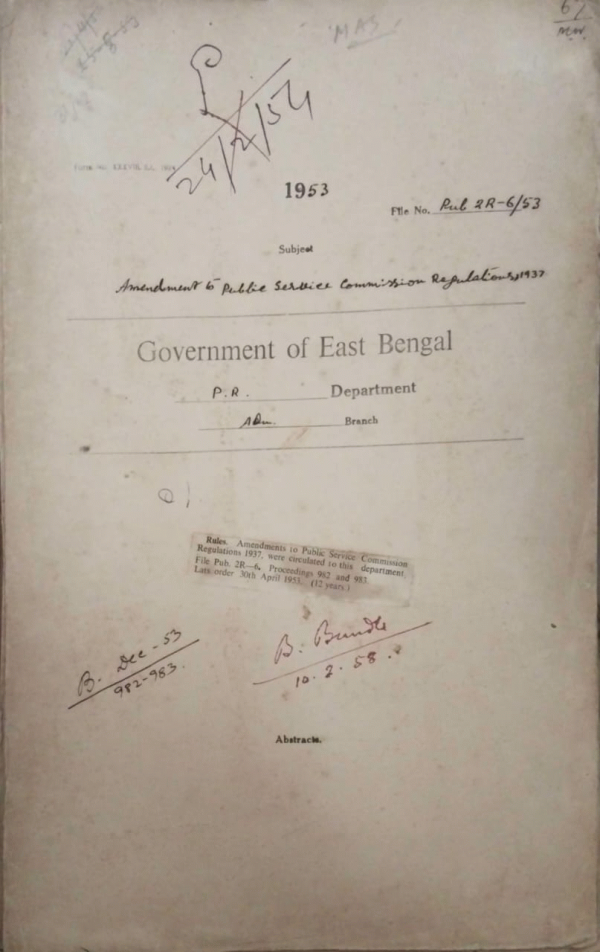 | Rack No. 18, Bundle No. 09, SI No. 614 Prayer from Mr. Fayzul Huq Khan assistant operator of the D.M. Unit, Dinajpur. | Rack No. 18, Bundle No. 09, SI No. 615 Amendment treasury rules. | Rack No. 18, Bundle No. 09, SI No. 616 Supply of information regarding acquisition of immovable property by govt. | Rack No. 18, Bundle No. 09, SI No. 617 Amendment of public service commission regulations 1937. | Rack No. 18, Bundle No. 09, SI No. 618 Ad-hoc rules for the regulations of recruitment to the L.D. of the clerical service of the secretariat govt. of East Bengal. | Rack No. 18, Bundle No. 09, SI No. 619 Furnishing of an explanatory note for each scheme to be placed before the development Board. | Rack No. 18, Bundle No. 09, SI No. 620 Purchase of priced publication of the govt. India by Pakistan Missions in India. |
