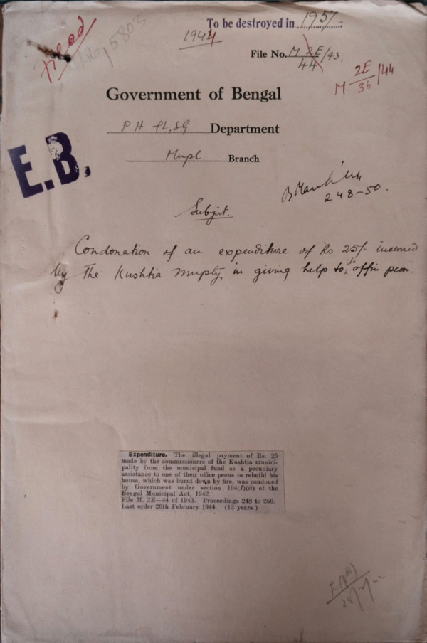 | Rack No. 13, Bundle No. 27, Sl No. 1860 Condonation of expenditure incurred by the Mymensingh Municipality Paid to Certain Persons. | Rack No. 13, Bundle No. 27, Sl No. 1861 Proposed Sanction to the expenditure incurred by the Narayanganj Municipality for supplying food staff to the menials of the Municipality of the B.M. Act | Rack No. 13, Bundle No. 27, Sl No. 1862 Supply of Papers to the Murshidabad Municipality. | Rack No. 13, Bundle No. 27, Sl No. 1863 Condonation of an expenditure of Rs. 25/- incurred by the Kushtia Municipality in giving help to its office peon. | Rack No. 13, Bundle No. 27, Sl No. 1864 Adoption of a additional set of bye-laws framed by the commissioners of the Pabna Municipality of the B.M. Act | Rack No. 13, Bundle No. 27, Sl No. 1865 Suspension of Certain resolutions passed on 31.8.40 by the Commiss18ioners of the Murshidabad Municipality. 136 | Rack No. 13, Bundle No. 27, Sl No. 1866 Postponement of revision of assessment of the Rajpur Municipality. |