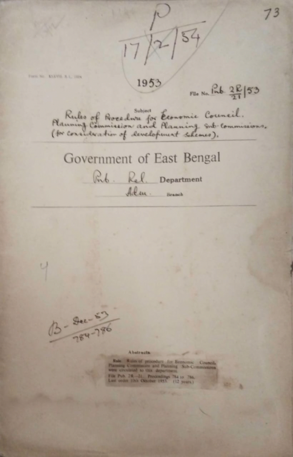 | Rack No. 18, Bundle No. 09, SI No. 618 Ad-hoc rules for the regulations of recruitment to the L.D. of the clerical service of the secretariat govt. of East Bengal. | Rack No. 18, Bundle No. 09, SI No. 619 Furnishing of an explanatory note for each scheme to be placed before the development Board. | Rack No. 18, Bundle No. 09, SI No. 620 Purchase of priced publication of the govt. India by Pakistan Missions in India. | Rack No. 18, Bundle No. 09, SI No. 621 Rules of procedure for Economic Council. | Rack No. 18, Bundle No. 09, SI No. 622 Amendment of treasury rules. | Rack No. 18, Bundle No. 09, SI No. 623 Retention of three posts of reporters and one post of additional photographer in the P.R. Department. | Rack No. 18, Bundle No. 09, SI No. 624 Purchase of films from govt. of Pakistan. |