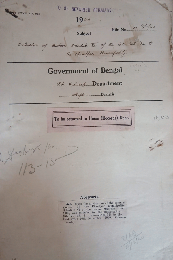 | Rack No. 13, Bundle No. 22, Sl No. 1497 Sanction to the expenditure of Rs. 14-4-9 incurred by the Rishra-Konnagore Municipality on a/c of supplying refreshment to the polling officers and members of the election committee. | Rack No. 13, Bundle No. 22, Sl No. 1498 Proposal for payment to the Cal. Corporation of Rs. 1798/- realized u/s 24 of the Cal. Fire Brigade Act. | Rack No. 13, Bundle No. 22, Sl No. 1499 L.A. by the Cal. I. Trust for alignment No. XXXII. | Rack No. 13, Bundle No. 22, Sl No. 1500 Extension of Schedule VI of the B.M. Act 32 to the Chandpur Municipality. | Rack No. 13, Bundle No. 22, Sl No. 1501 L.A. by the Calcutta I Trust for Scheme no. L. | Rack No. 13, Bundle No. 22, Sl No. 1502 Grant of permission to Mr. Taraprasad Chatterjee, an employee of the E.B. Ry. to Stand as a commissioner of the Panihati Municipality. | Rack No. 13, Bundle No. 22, Sl No. 1503 Proposal for modification of the provision of the C.M. Act 1923 as extended to the Howrah Municipality. |