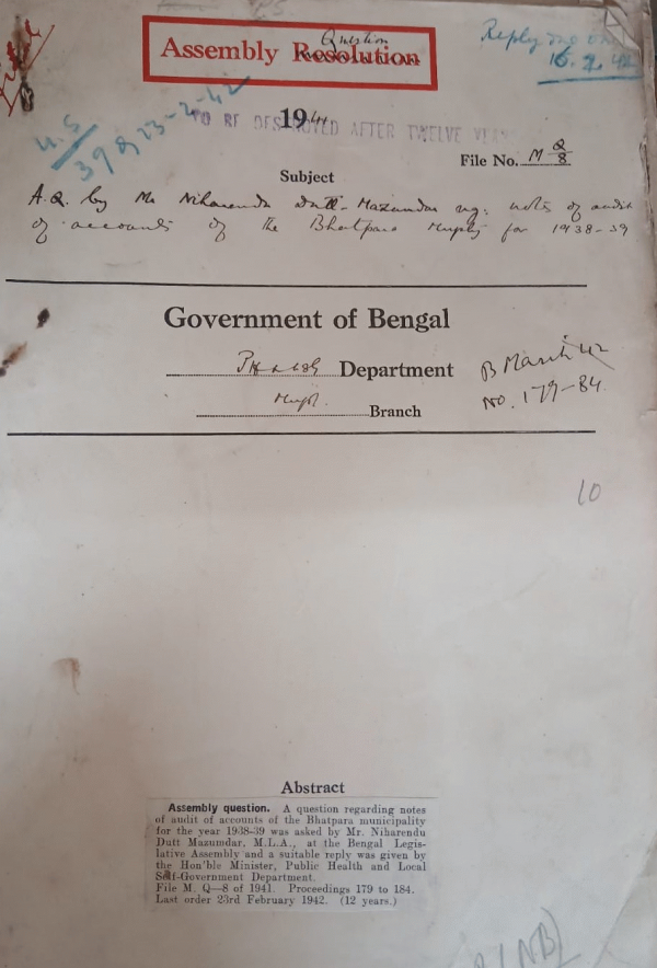 | Rack No. 13, Bundle No. 22, Sl No. 1507 Removal of a commissioner of the Taki Municipality. | Rack No. 13, Bundle No. 22, Sl No. 1508 Appointment of Mr. Sailpati Chatterjee as the Chief executive officer, Cal. Corporation. | Rack No. 13, Bundle No. 22, Sl No. 1509 Adoption of model Rule for the grant of extraordinary gratuity to Municipality employees by the Cox Bazar Municipality | Rack No. 13, Bundle No. 22, Sl No. 1510 A.Q. by Mr. Niharendu Dutt Mazumdar regarding notes of audit of accounts of the Bhatpara Municipality for 1938-39. | Rack No. 13, Bundle No. 22, Sl No. 1511 Preventive measures against the starring of bulls in Calcutta. | Rack No. 13, Bundle No. 22, Sl No. 1512 Budget Estimate of the Serajganj Municipality: | Rack No. 13, Bundle No. 22, Sl No. 1513 Notes of audit of accounts of the Scrampur Municipality . |