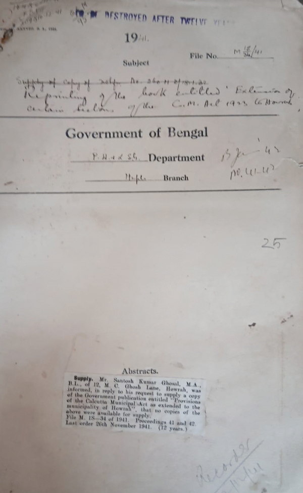 | Rack No. 13, Bundle No. 22, Sl No. 1522 Adoption of the model provident fund Rules by the Panihati Municipality. | Rack No. 13, Bundle No. 22, Sl No. 1523 L.A. by the North Barrackpore Municipality for a Public Recreation ground at Palta. | Rack No. 13, Bundle No. 22, Sl No. 1524 Payment of Contribution by Municipality towards the expenses incurred in connection with the census for the year, 1941. | Rack No. 13, Bundle No. 22, Sl No. 1525 Supply a copy of the Govt. Publication entitled "Provisions of the Cal. Municipality Act as extended to the Municipality of Howrah". | Rack No. 13, Bundle No. 22, Sl No. 1526 Conference of Chairman of Municipality. | Rack No. 13, Bundle No. 22, Sl No. 1527 Grant of an advance from G.P. Fund to Mvi. Md. Sakhawat Ali, an assistant of the P.H. and LS.G. Department. | Rack No. 13, Bundle No. 22, Sl No. 1528 Re-imbursement of the Cost of Services actually rendered by the local bodies to Railways u/s. 135(4) of the Indial Ry. Act 1890. |