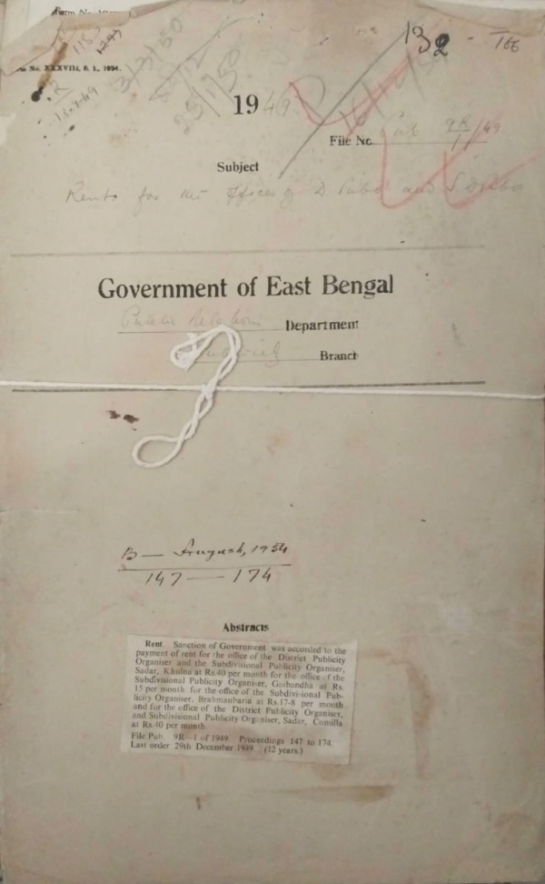 | Rack No. 18, Bundle No. 09, SI No. 634 Execution of the re-conveyance bound for the house -building advance taken by Mr. Quazi Din Muhammad. | Rack No. 18, Bundle No. 09, SI No. 635 Channel Correspondence between the govt. of East Bengal and foreign mission stationed at Dacca. | Rack No. 18, Bundle No. 10, SI No. 636 Preparation and Exhibition of a slide on recruitment of central excise Inspectors. | Rack No. 18, Bundle No. 10, SI No. 637 Rent for the offices of D. Pub. Organization and S.D. publicity organizer. | Rack No. 18, Bundle No. 10, SI No. 638 Retention of the essential staff of the field publicity organization for the year 1950-51. | Rack No. 18, Bundle No. 10, SI No. 639 The East Bengal Legislative Assembly rules 1950. | Rack No. 18, Bundle No. 10, SI No. 640 Supply of particulars to D.M. Rajshahi for gratuity leave to the Driver Niamatullah of the D.M. Unit. |