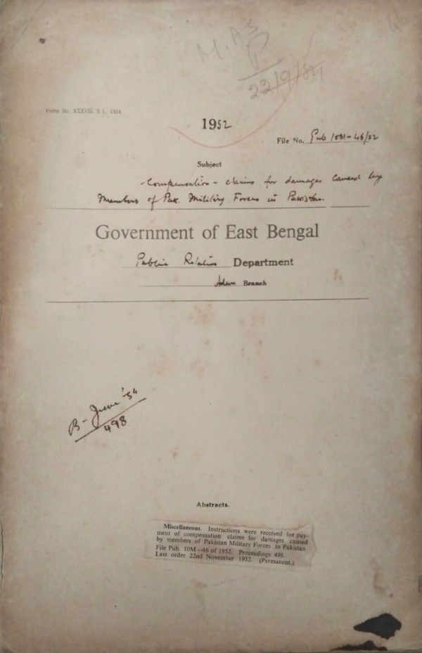 | Rack No. 18, Bundle No. 10, SI No. 642 Syed Shamse Alam Nuruddin Ahmed was appointed in the resultant vacancy. | Rack No. 18, Bundle No. 10, SI No. 643 History of services of Gazetted officers. | Rack No. 18, Bundle No. 10, SI No. 644 Production of the film "Salamat". | Rack No. 18, Bundle No. 10, SI No. 645 Compensation Claims for damage caused by members of Pakistan Military Forces in Pakistan. | Rack No. 18, Bundle No. 10, SI No. 646 Requests for category "D" (Officers) visas for the officers of the Provincial Govt. | Rack No. 18, Bundle No. 10, SI No. 647 Rules regarding re-employment of retired govt. Servants. | Rack No. 18, Bundle No. 10, SI No. 648 Arragements for regarding the services book of Mvi. Jalaluddin Ahmed operator D.M. Unit, Chittagong. |