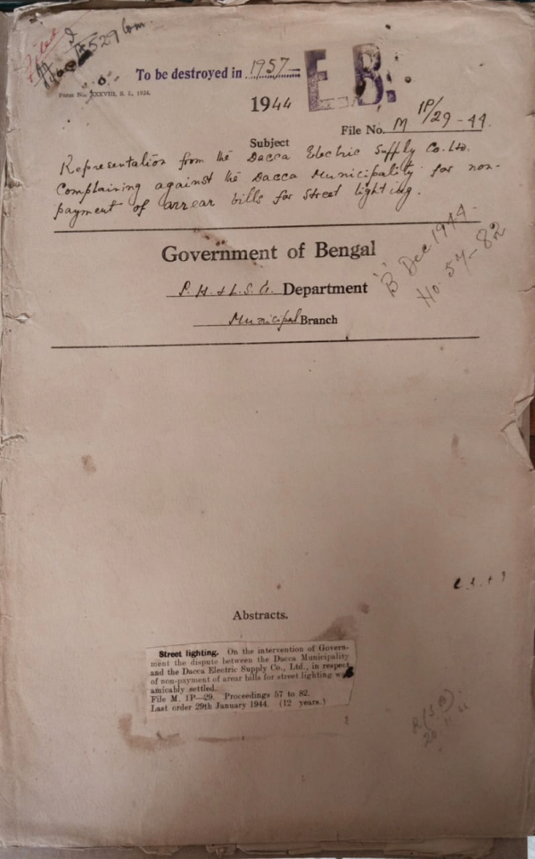 Representation from the Dacca Electric Supply Co. Ltd. Complying against the Dacca Municipality for non-payment of arrear bills for street lights.