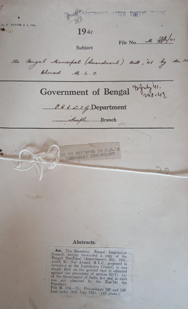 | Rack No. 13, Bundle No. 22, Sl No. 1526 Conference of Chairman of Municipality. | Rack No. 13, Bundle No. 22, Sl No. 1527 Grant of an advance from G.P. Fund to Mvi. Md. Sakhawat Ali, an assistant of the P.H. and LS.G. Department. | Rack No. 13, Bundle No. 22, Sl No. 1528 Re-imbursement of the Cost of Services actually rendered by the local bodies to Railways u/s. 135(4) of the Indial Ry. Act 1890. | Rack No. 13, Bundle No. 22, Sl No. 1529 The Bengal Municipality (Amendment) Bili, 41 by Mr. Nur Ahmed M.L.C. | Rack No. 13, Bundle No. 22, Sl No. 1530 Proposal of grauting a reward of Rs. 175/- do their ex conservancy overseer by the Ranaghat Municipality | Rack No. 13, Bundle No. 22, Sl No. 1531 Sanction to the expenditure of Rs. 250/- incurred by the commissioners of the Garden Reach Municipality in con, with the opening ceremony of the Wallace charitable Dispensary. | Rack No. 13, Bundle No. 22, Sl No. 1532 Report on the working of the Cal. Fire Brigade for the year 1940-41. |