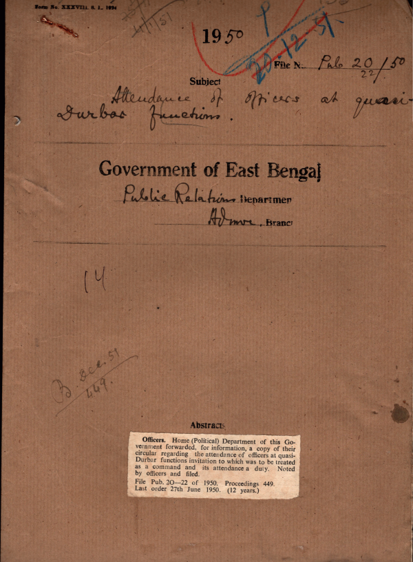 | Rack No. 18, Bundle No. 03, SI No. 173 Particulars about the District and Sub divisional Publicity staff. | Rack No. 18, Bundle No. 03, SI No. 174 Rent for the officers of certain District Publicity Organizer and Sub-divisional Publicity organizer was sanctioned. | Rack No. 18, Bundle No. 03, SI No. 175 Shamsul Haque peon of this department was discharged by this office order No. 2364 Pub, as he joined the Police Department without the permission of this Department with effect from 3rd September 1950. | Rack No. 18, Bundle No. 03, SI No. 176 Attendance of officers of quasi- Durber function. | Rack No. 18, Bundle No. 03, SI No. 177 Employment of the Royal Pakistan Navy Fleet Reservists in Government Department. | Rack No. 18, Bundle No. 03, SI No. 178 Preparation of Index of the Dacca Gazette. | Rack No. 18, Bundle No. 03, SI No. 179 Opening of Service Book of Mvi. Md. Jafor operator. |