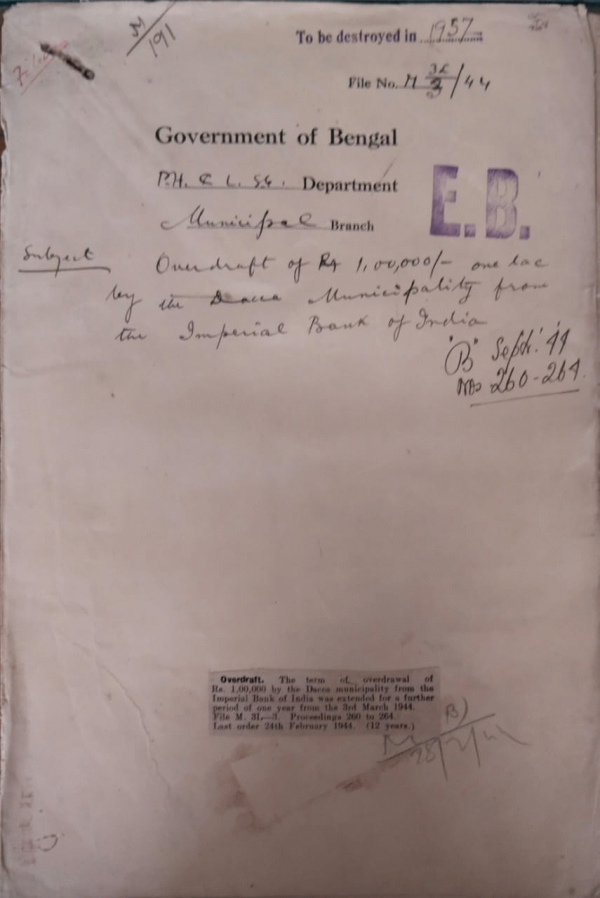 | Rack No. 13, Bundle No. 28, Sl No. 1896 L.A. by the Chittagong Municipality for the improvement of the Junction of the Reazuddin Road with the Jubilee Road in the village of Battali. | Rack No. 13, Bundle No. 28, Sl No. 1897 L.A. by the Dacca-Municipality for the quarters of the Burial ground staff at Azimpur in the village of Nutan Paltaner Line. | Rack No. 13, Bundle No. 28, Sl No. 1898 Supply of Paper to Narayanganj Municipality. | Rack No. 13, Bundle No. 28, Sl No. 1899 Over drawl of Rs. 1,00,000/- One Lac by the Dacca Municipality from the imperial Bank of India. | Rack No. 13, Bundle No. 28, Sl No. 1900 Proposal for extension term of office of the Commissioners of the English Bazar Municipality. | Rack No. 13, Bundle No. 28, Sl No. 1901 Appointment of a representative of the Chittagong Municipality on the Chillagong Post Commission. | Rack No. 13, Bundle No. 28, Sl No. 1902 Rules regarding Creation of a Methors Barus fund by the Dacca Municipality. |