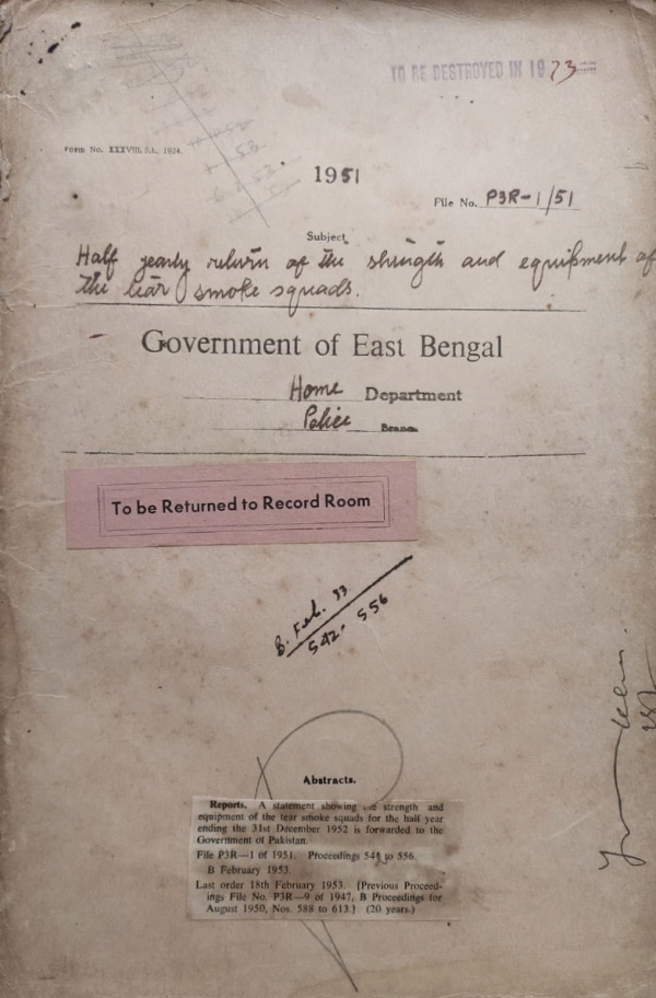 | Rack No. 42, Bundle No. 08, Sl No. 575 Refusal of Passport facilities to Shams Din by the Govt. of Bombay | Rack No. 42, Bundle No. 133, Sl No. 12239 Electrification of the officers barracks and Quarters in the Police line at Barisal. | Rack No. 42, Bundle No. 133, Sl No. 12240 International Telecommunication Union Publications List of Aeronautical & Aircraft Stations- 20th Edition. | Rack No. 42, Bundle No. 133, Sl No. 12241 Half Yearly Return of the strength and equipment of the tear smoke squads. | Rack No. 42, Bundle No. 133, Sl No. 12242 Appeal petition of ex-S.I Mvi Kazi Lutfar Rahman of the Khulna district Police Force. | Rack No. 42, Bundle No. 133, Sl No. 12243 Payment of rent hours owned by Mvi Abdul Ghani Chowdhury and Babu P.L Sewn at Comilla and occupied by Police. | Rack No. 42, Bundle No. 133, Sl No. 12244 Acquisition of land required for raising and leveling the compound of Mohanganj P.S. in the district of Mymensingh |
