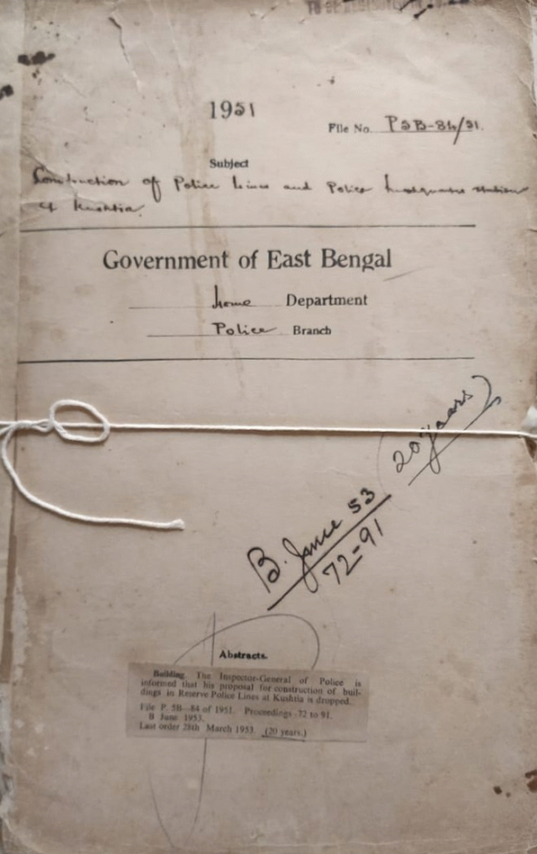 | Rack No. 42, Bundle No. 133, Sl No. 12242 Appeal petition of ex-S.I Mvi Kazi Lutfar Rahman of the Khulna district Police Force. | Rack No. 42, Bundle No. 133, Sl No. 12243 Payment of rent hours owned by Mvi Abdul Ghani Chowdhury and Babu P.L Sewn at Comilla and occupied by Police. | Rack No. 42, Bundle No. 133, Sl No. 12244 Acquisition of land required for raising and leveling the compound of Mohanganj P.S. in the district of Mymensingh | Rack No. 42, Bundle No. 133, Sl No. 12245 Construction of police line and police headquarters buildings of Khulna | Rack No. 42, Bundle No. 133, Sl No. 12246 Proposal for Sanction to the establishment of small police mobile workshop at Dacca. | Rack No. 42, Bundle No. 133, Sl No. 12247 Purchase of type writer machines for use in the office of the sub divisional police officers. | Rack No. 42, Bundle No. 133, Sl No. 12248 Enhancement of contingency for of offices of Dist. And Subdt. Ansars Adjutant. |