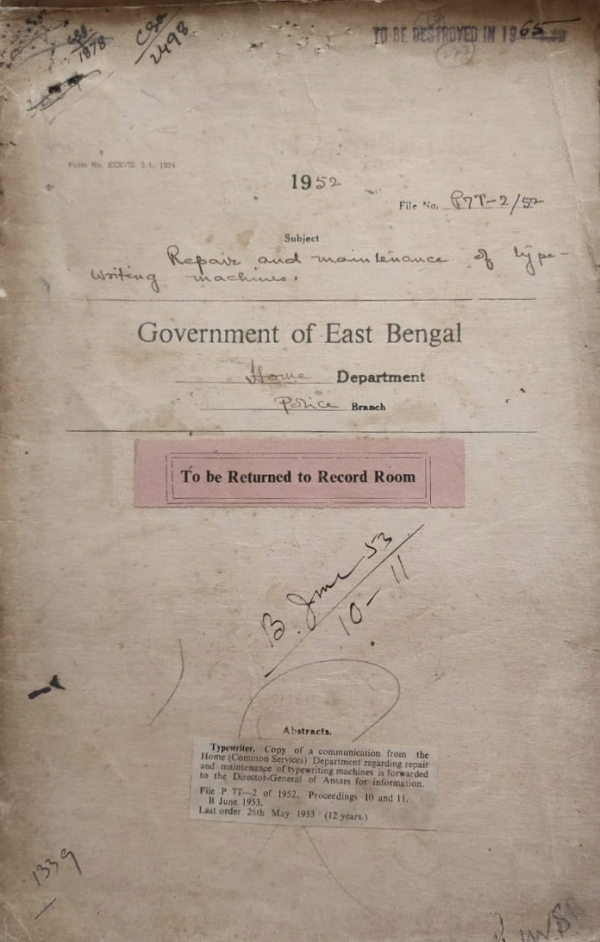 | Rack No. 42, Bundle No. 133, Sl No. 12247 Purchase of type writer machines for use in the office of the sub divisional police officers. | Rack No. 42, Bundle No. 133, Sl No. 12248 Enhancement of contingency for of offices of Dist. And Subdt. Ansars Adjutant. | Rack No. 42, Bundle No. 133, Sl No. 12249 Non-Co-Operation of the Customs staff at Birole Railway Station Dinajpur with the Railway Police. | Rack No. 42, Bundle No. 133, Sl No. 12250 Repair and maintenance of type writing machines. | Rack No. 42, Bundle No. 133, Sl No. 12251 Non-co-operation of one Azizur Rahman and others ctg. With the local Ansars. | Rack No. 42, Bundle No. 133, Sl No. 12252 Construction of Kutcha Structures near the Railway bridges on the E.B Rly. For the accommodation of the bridge ground. | Rack No. 44, Bundle No. 01, Sl No. 02 Absorption of Mr. Md. Wali Ahmed Bhuiyan, surplus steno typist of erstwhile Government of Pakistan. |
