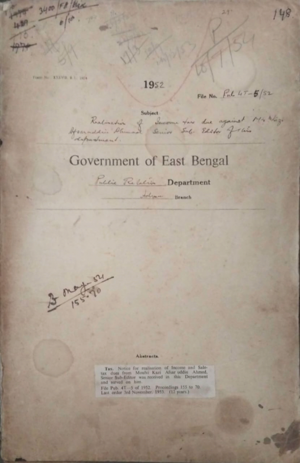 | Rack No. 18, Bundle No. 10, SI No. 655 Arrangement were made for the fixation of the pay of Mvi. Md. Waliullah in the prescribed scale. | Rack No. 18, Bundle No. 10, SI No. 656 Preparation of yearly Index of Dacca Gazette. | Rack No. 18, Bundle No. 10, SI No. 657 Temporary appointment of medical officers and compounders under the district Mobile Unit, Dinajpur. | Rack No. 18, Bundle No. 10, SI No. 658 Realisation of Income tax due against Mvi, Kazi Afsar Uddin Ahmed Senior sub-editor . | Rack No. 18, Bundle No. 10, SI No. 659 Safeguards against frauds and forgeries payment of crossed cheques. | Rack No. 18, Bundle No. 10, SI No. 660 Exhibition of films . N.W.F.P. | Rack No. 18, Bundle No. 10, SI No. 661 Grant of leave to Mr. Anwar Hussain Dy. director of public , govt. of East Bengal. |