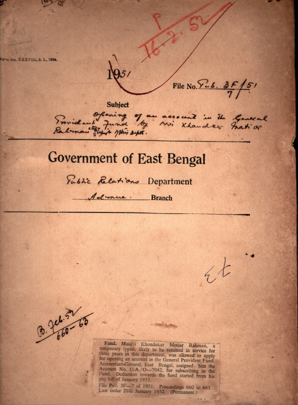 Opening of an account in the General Provident fund by Mvi. Khandker Motiar Rahman a for three years in this Department.