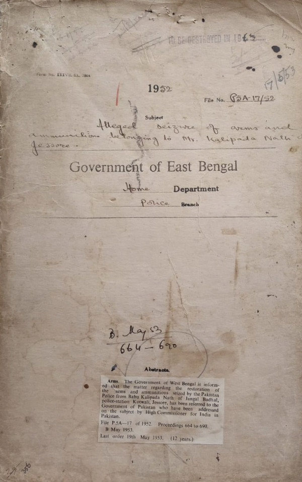 Alleged seizure of arms and ammunitions belonging to Mr. Kalipada Nath of Jessore.