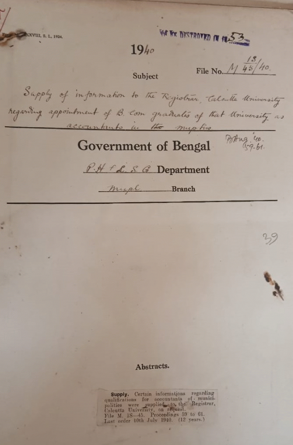 | Rack No. 13, Bundle No. 20 Sl No. 1336 Census enumeration by Govt. Servants. | Rack No. 13, Bundle No. 20 Sl No. 1337 A.Q. by Mr. Atul Krishna Ghose regarding particulars of tenants at will living in Calcutta. | Rack No. 13, Bundle No. 20 Sl No. 1338 Venturi Meter installed on the Garden Reach main for Calculating the Supply of water the Garden Reach Municipality. | Rack No. 13, Bundle No. 20 Sl No. 1339 Supply of information of the Registrar, Cal, university regarding appointment of B. Com graduates of the university as accounts in Municipality | Rack No. 13, Bundle No. 20 Sl No. 1340 Sanction to an expenditure of Rs. 53/5 incurred by the Rangpur Municipality for organizing a volunteer corporations during the last Puja night. | Rack No. 13, Bundle No. 20 Sl No. 1341 L.A. by the Kandi Municipality for extension of a lane in ward No. II in the Village of Raghunathpore. | Rack No. 13, Bundle No. 20 Sl No. 1342 Representation of the Indian Chamber of Commerce on the Board of the Cal. Improvent Trust |
