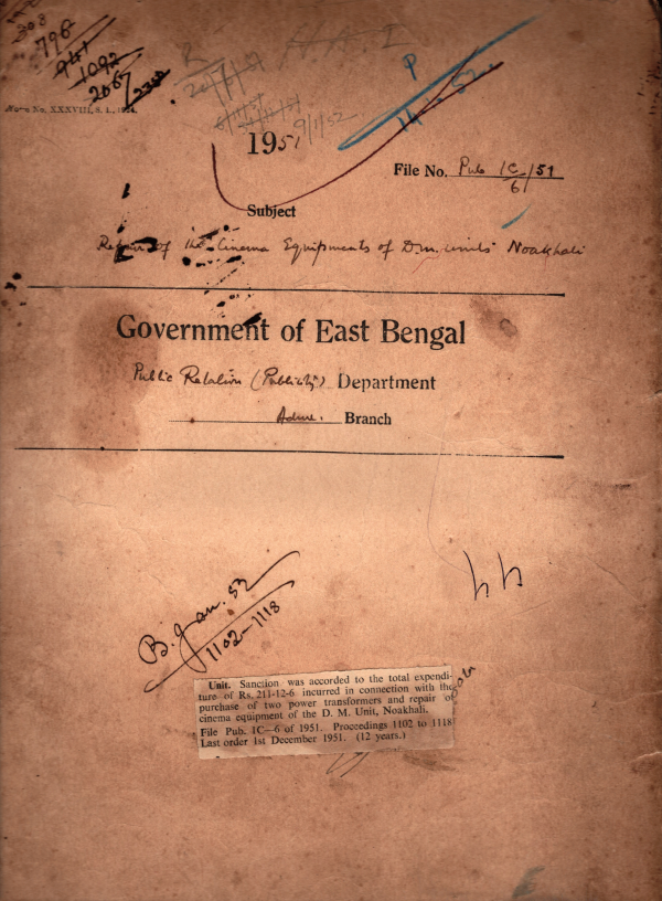 | Rack No. 18, Bundle No. 03, SI No. 203 Prof pages of quarterly Pakistan Civil List Concerning the Public Relations Department of this Government after necessary correction made therein. | Rack No. 18, Bundle No. 03, SI No. 204 Maulvi. Md. Abdus Samad and Maulvi. Abdus Samad Khan offered to stand surety for for a loan from the P.R.R. Finance Corporation. | Rack No. 18, Bundle No. 03, SI No. 205 Particulars of Name staff under the District and Sub- Divisional Publicity Units were received and recorded in the Establishment list maintained by the Department. | Rack No. 18, Bundle No. 03, SI No. 206 Report on the Condition of the Generating Plant of the District Mobile Unit, Noakhali. | Rack No. 18, Bundle No. 03, SI No. 207 Petitions for the Post of D. Pub. Os. and S.D. Pub.D.S. | Rack No. 18, Bundle No. 03, SI No. 208 A radio set offered by an U.S. firms was found unsuitable. | Rack No. 18, Bundle No. 03, SI No. 209 List of Persons dismissed and debarred from future employment under Government. |