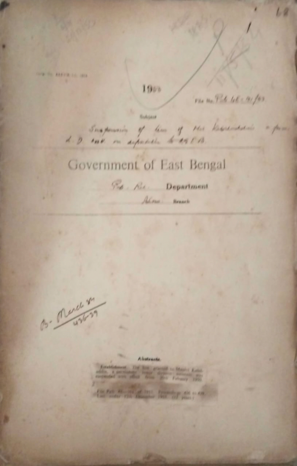 | Rack No. 18, Bundle No. 10, SI No. 667 Prayer from M.S. Khwaja Mustaq Ahmed for a free gift of a copy documentary film in our Midst. | Rack No. 18, Bundle No. 10, SI No. 668 Fixation of pay of Govt. servants appointed on or after the Ist April 1949. | Rack No. 18, Bundle No. 10, SI No. 669 Dismissal of Gulam Hyder a temporary farash from Govt. service was noted and filed. | Rack No. 18, Bundle No. 10, SI No. 670 Suspension of lien of Mvi. Kabiluddin, a permanent L.D. Assistant. | Rack No. 18, Bundle No. 10, SI No. 671 Appointment of sub-divisional public organizer, Tangail. | Rack No. 18, Bundle No. 10, SI No. 672 Technical and operational circular No. 4 in respect of use and Maintenance of Accumulators. | Rack No. 18, Bundle No. 10, SI No. 673 Statement of stock of Furniture as stood on 30.06.53. |